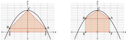 Two possible configurations of a house shape drawn below a parabola are shown below.